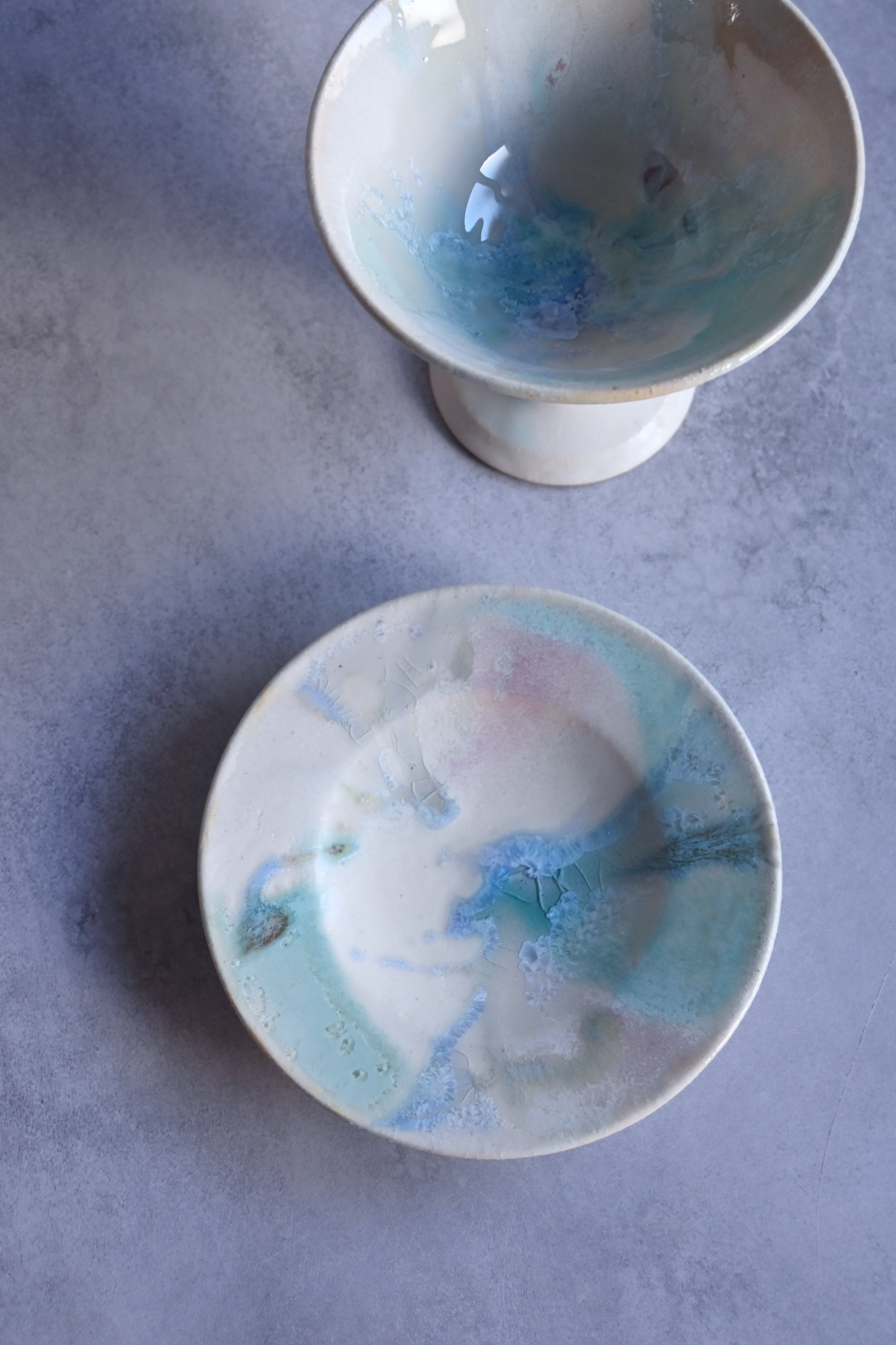 細かな結晶のでる白マットをベースに淡いグリーン、ピンク、ブルーのガラスを配色しているジェラートスタンドとミニ皿のセットです。